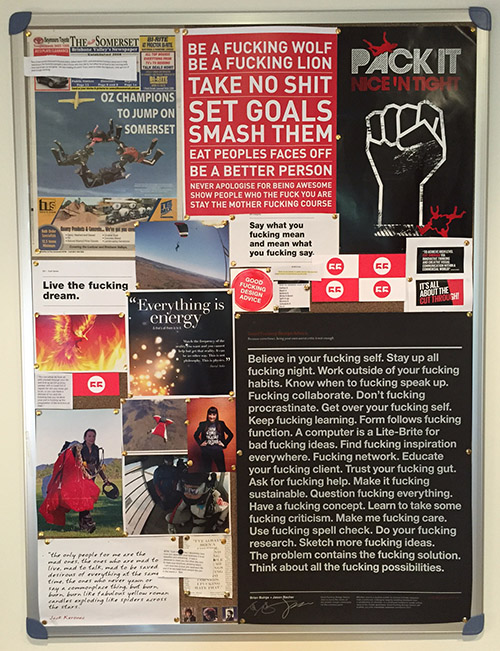 I’m a visual person and am always putting things on my noticeboard that motivate me or make me happy, or represent what I aspire to in the future. I could not work in a bland space. I can’t get by without my visual walls because they remind me of passion, source energy and drive.